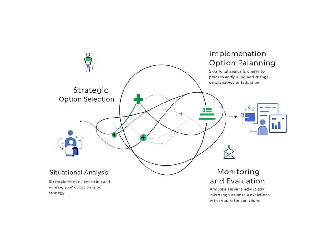 - The process consists of four interconnected stages: situational analysis, strategic option selection, implementation, and continuous evaluation.